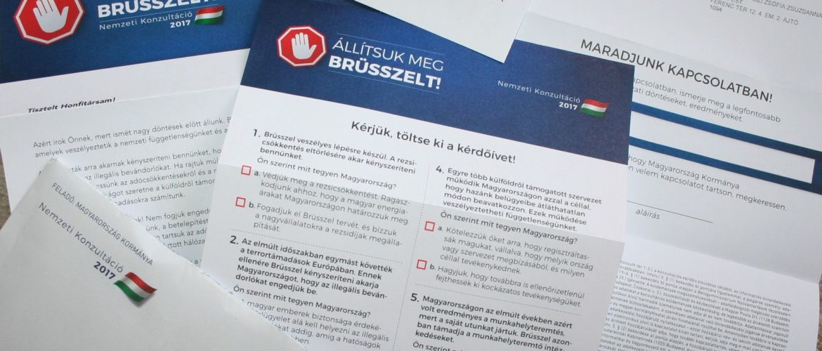 Les 8 millions d’électeurs hongrois reçoivent ces jours-ci dans leur boite aux lettres la nemzeti konzultáció 2017 par laquelle le gouvernement souverainiste cherche l’appui de la population contre ce qu’il présente comme des ingérences de l’Union européenne.