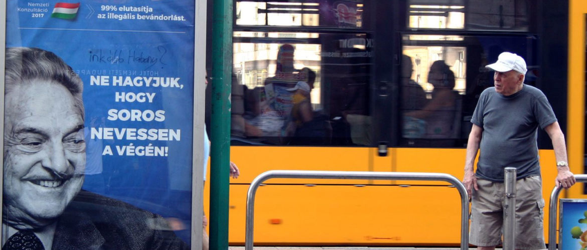 « Ne laissons pas George Soros rire à la fin ». Tel est le message ad hominem qui envahit depuis quelques semaines les espaces publics de Budapest et du reste du pays. En lettres blanches sur fond bleu, ces affiches collent parfaitement à la charte graphique du gouvernement, lequel est bien le commanditaire de cette campagne particulièrement agressive contre le milliardaire américain d’origine juive hongroise.