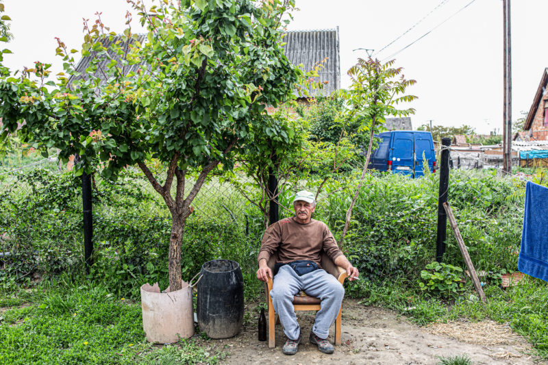 « Si les crottins de cheval ne vous dérangent pas, entrez donc ! » Rien ne sépare l’entrée de la propriété de Róbert Vékás du chemin de terre, seuls des plots colorés en bois ont été plantés autour de la maison. Des fleurs ont été disposées entre les racines des arbres, tandis que les fraisiers occupent le reste du terrain. Il y a une époque où la clôture allait jusqu’au bout, mais elle a été volée. Róbert ne semble pas plus perturbé que ça ; il est d’un tempérament pacifique, nous explique-t-il. Quand il fait beau et qu’il est à la maison, il sort volontiers fumer dans son vieux fauteuil en cuir, à quelques mètres des chevaux de son beau-frère.