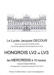 L’info nous vient du Blog des mardis hongrois de Paris : les lycéens parisiens pourront désormais se mettre au magyar ! Dès cette rentrée 2010, des cours de hongrois seront proposés aux élèves de l’Académie de Paris. Une très bonne nouvelle pour la relation France-Hongrie. Si en Hongrie, des cours de français sont dispensés depuis longtemps dans les écoles, c’est la première fois qu’un établissement français propose des cours de hongrois, langue réputée comme étant très difficile. Ceux-ci se dérouleront au Lycée Jacques Decour le mercredi après-midi et seront inclus dans le cursus français standard, puisque les cours seront enseignés au choix, en LV2 ou LV3.