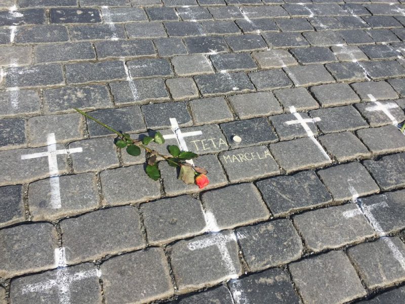 Sur cette place qui croule habituellement sous l’afflux de touristes, les chiffres de l’épidémie sont devenus des symboles, qui eux sont devenus des visages. L’émotion me prend à la gorge devant cette marée de petites croix, de bougies, de fleurs, de noms.