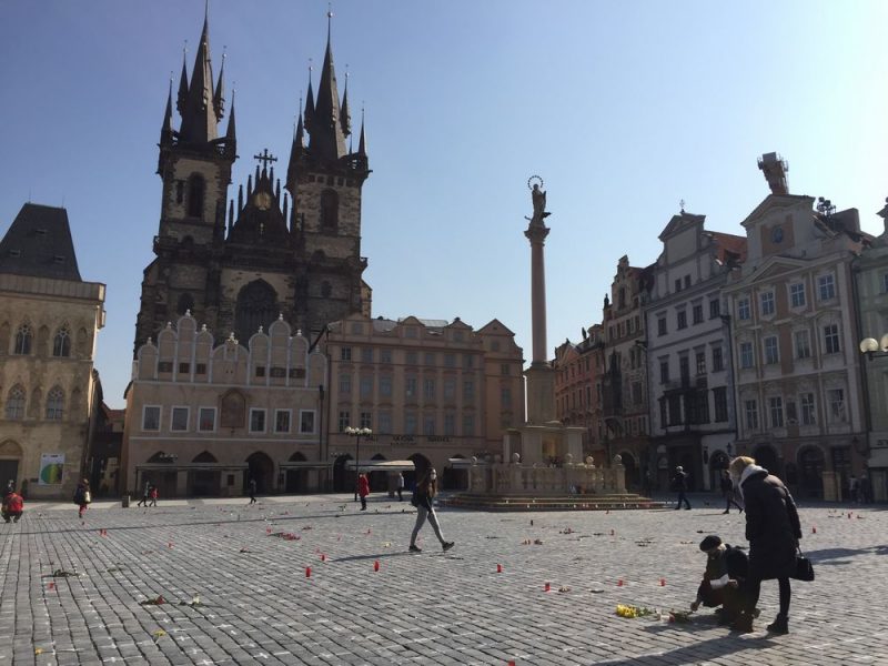 Une grand-mère invite ses petits-enfants à prier près de la Colonne de la Vierge au milieu de la place. Un vieil homme écrit à la craie le nom d’un parent et laisse des fleurs et une bougie sur les pavés. D’autres se recueillent au-dessus d’une autre de ces petites croix. Le sol est jonché de bougies et de fleurs. “Tante Marcela”, “Grand-mère 9.12.20”, “Mon frère Franta”, peut on lire sur les pavés ça et là. Plus loin, “Grand-mère” et “Papa” sont liés par deux flèches, marquant le double deuil d’une famille.