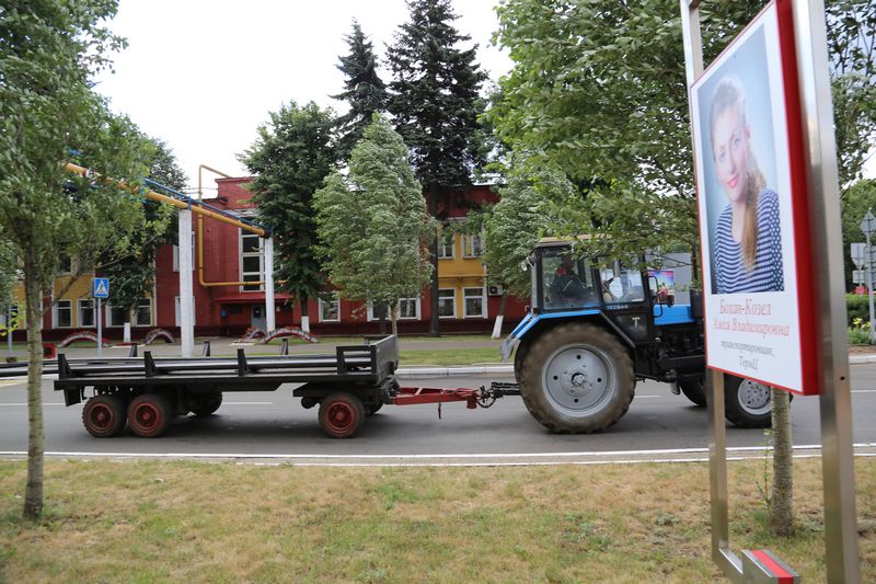 A la sortie, en grimpant l’escalier de la station fraîchement nettoyée par les employés-balayeurs (en ville, ils sont partout avec leur dossard orange, travaillent nuit et jour à la propreté urbaine), on aperçoit une enfilade de bolides : des tracteurs, rouges, verts, des grands et des petits, méticuleusement garés sur le parc de stationnement… Comme s’ils étaient là pour annoncer fièrement l’usine de tracteurs de Minsk ! Pendant qu’un ouvrier astique l’un de ses bolides, une femme d’âge mur s’emploie à dépoussiérer l’allée proprette avec son balai de paille. Un véritable univers parallèle, oui.