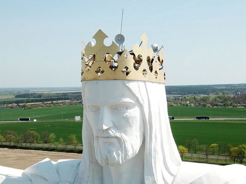 Construite en béton armé en 2010, la statue toute blanche est une œuvre monumentale qui ne souffre pas la comparaison avec celles du Christ Rédempteur de Rio de Janeiro et du Christ de la Concordia en Bolivie. A cette différence près que le Christ de Świebodzin (21 000 âmes) porte en plus une couronne dorée de trois mètres de haut…et qu’il capte l’internet.