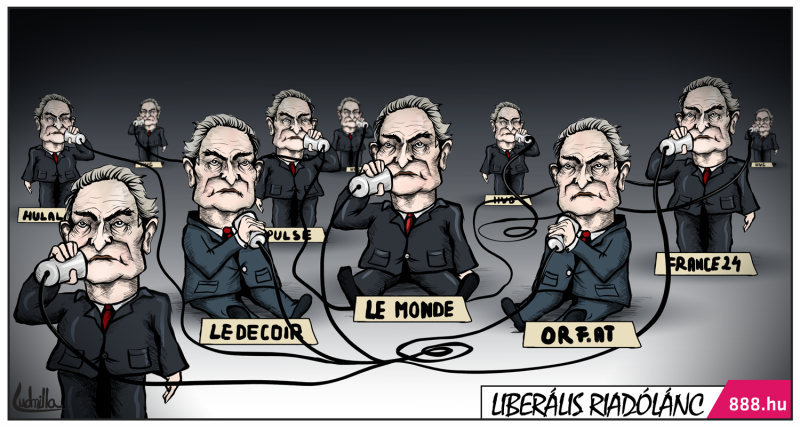 On ne va pas le cacher, la caricature du jour du site 888.hu nous a faits beaucoup rire. L’objet, un dessin dans lequel Hulala est représenté – avantageusement – aux côtés de médias bien établis tels que Le Monde, Le Devoir et France 24, sous les traits du milliardaire hongro-américain George Soros. Nous serions ainsi un des maillons du « système d’alerte libéral de gauche », pour avoir relayé le message de l’association des journalistes hongrois dénonçant le « listage » de « journalistes ennemis de la nation » réalisé par le même site d’information, 888.hu. L’auteure du dessin officie chaque jour pour ce média pro-Fidesz, en multipliant les illustrations (souvent plagiées) contre les Musulmans, les médias et responsables politiques « ballib » (de gauche libérale) et les « Soros-boys ». Bref, tout ce qu’exècre le gouvernement hongrois et contre lequel il mène bataille, à la manière de Don Quichotte contre ses moulins imaginaires.