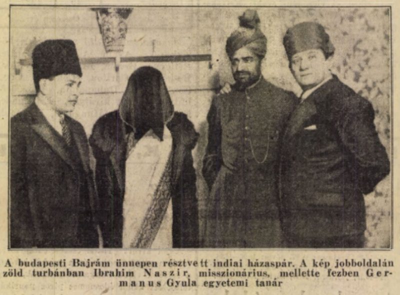 Le 12 février 1938 peu avant 9h30, une foule de personnes extravagantes s’est réunie dans la villa. Parmi celles-ci, on peut apercevoir le célèbre orientaliste Gyula Germanus la tête ornée d’un fez, le peintre et orientaliste autodidacte à la barbe abondante Ferenc Zajti ou encore Ahmed Gol Aga, un Iranien qui possédait une pâtisserie rue Hernád. Ces curieux personnages se sont réunis ici pour célébrer l’Aïd al-Adha, la « fête du sacrifice » à l’initiative de Ayaz Khan et d’Ibrahim Nassir, deux missionnaires venus de la ville de Qadian dans le Pendjab indien. La presse hongroise de l’époque se passionne pour ces deux personnages en habits traditionnels et à la tête coiffée d’un turban, mais est également perplexe car les Musulmans de Hongrie bien que n’étant que 250-300 étaient divisées en trois communautés. Pour mieux comprendre la situation, laissons Gyula Germanus nous donner plus de précisions (source : 8 Órai Ujság, février 1938) :