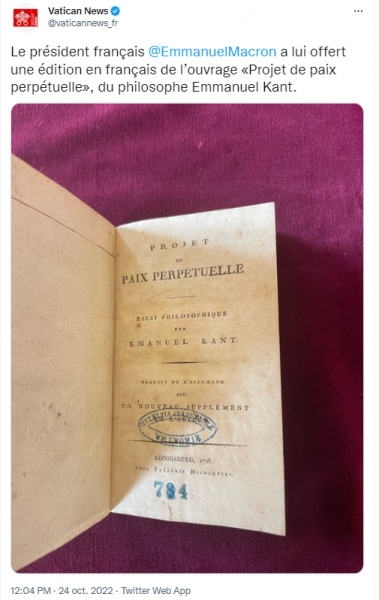 Le 24 octobre 2022, lors d’une visite officielle au Vatican, le président Emmanuel Macron offrait au pape François un exemplaire du Projet de paix perpétuelle du philosophe allemand Emmanuel Kant. La publication d’une photographie de cet ouvrage sur le compte Twitter de Vatican News déclenchait la polémique en Pologne : sur la page de couverture figure en effet un tampon indiquant que le volume a appartenu à une institution culturelle polonaise. Ce qui devait immédiatement déclencher une tempête de protestations au sein d’un pays particulièrement éprouvé dans le passé par les pillages culturels, au fil des occupations étrangères et des démembrements qui ont marqué son histoire, notamment à l’époque du nazisme.